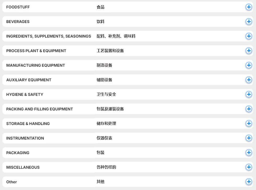 食品:甜点、零食、果蔬产品、粮油米面制品、肉禽水产、熟食及预制食品、乳制品(、糖果糕点、调味品、婴儿食品、清真食品、保健功能食品、运动营养、冷冻食品、罐头食品、干果、谷物及种子坚果