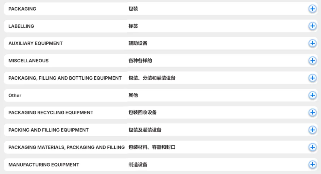 罐装自动机、真空包装机、裹包机、热收缩包装设备、灌装设备、制袋机、封口设备、码垛机、计量器、包装自动机、分装设备、喷码设备、纸箱成型及涂箱设备、捆扎工具、散货包装设备