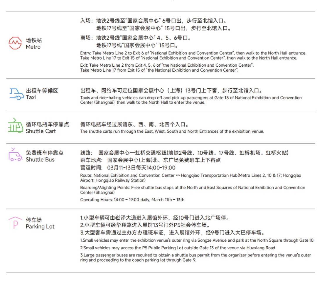 3.大型客车需通过主办方办理车证,进入展馆外环,经9号门进入大巴停车场。