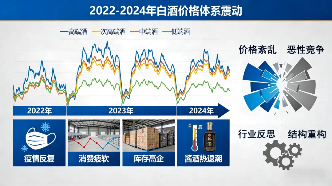 2022—2024年,是白酒价格体系震荡最剧烈的三年,受疫情反复、消费疲软、库存高企、酱酒热退潮等多重因素影响,各价格带均陷入困境,价格紊乱、恶性竞争加剧,倒逼行业反思价格策略,推动价格带结构重构。这三年的震荡,是行业从增量向存量转型中,消费变化与企业非理性竞争共同作用的结果,也为2025年修复、2026年格局定型奠定基础。