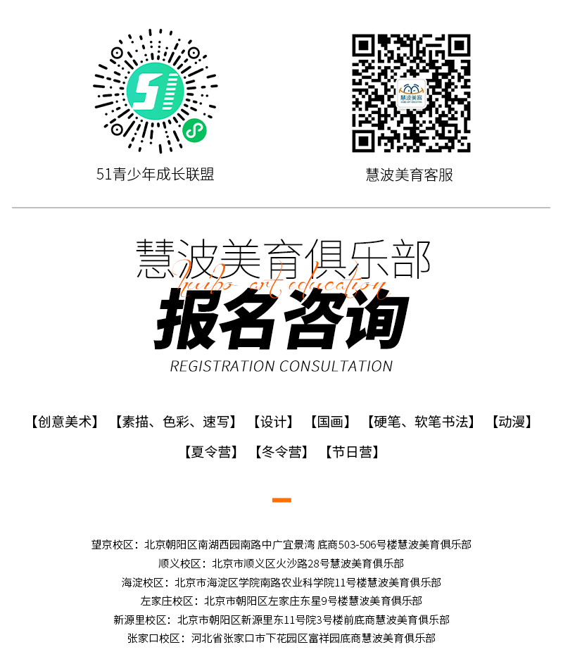 慧波美育是以兴趣爱好为前提,以素质培养为基础,以多元探索为支撑,以提高创意思维与审美为目标的综合性青少年美育素质成长俱乐部。