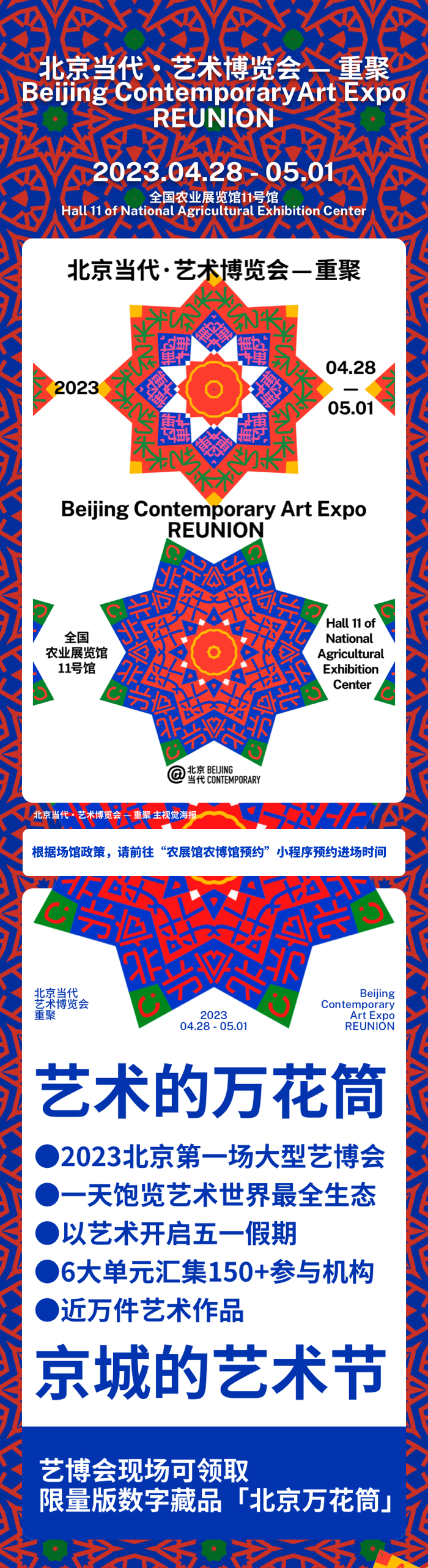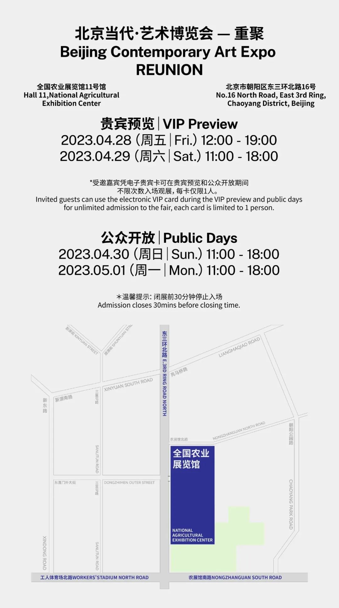 「北京当代·艺术博览会 — 重聚」将于2023年4月28日至5月1日,在北京的全国农业展览馆11号馆举办。其中4月28日和29日为贵宾预览日,4月30日和5月1日为公众开放日。