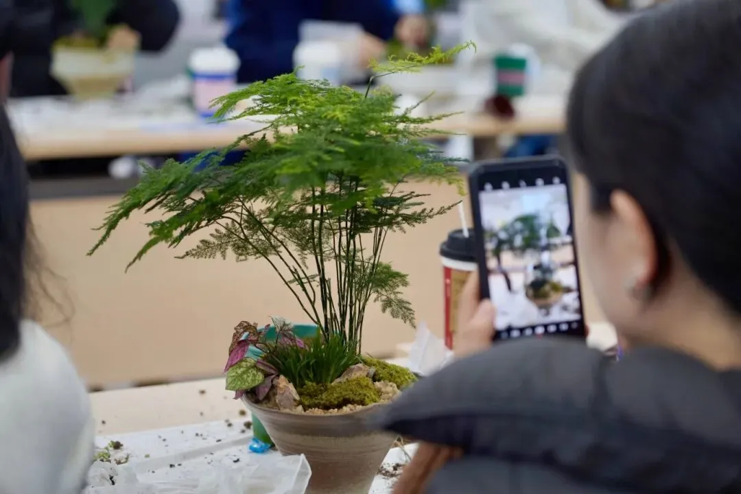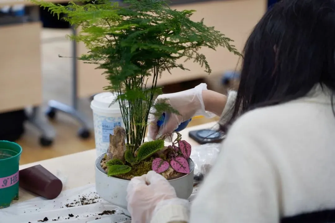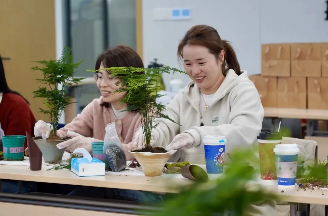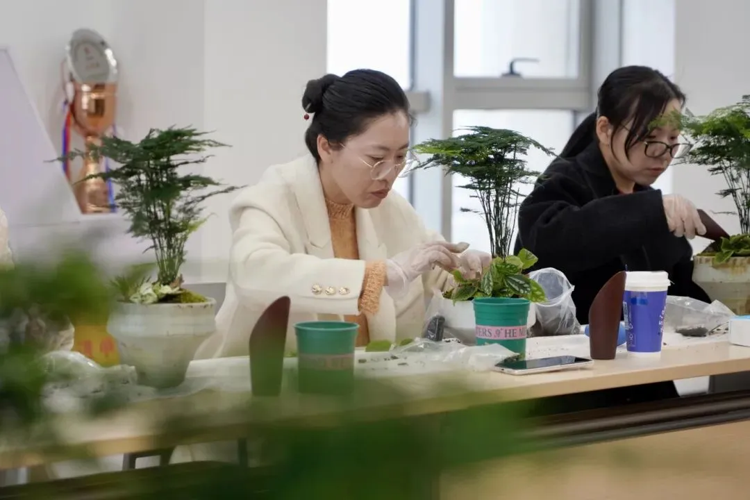 进入动手创作环节,女职工们化身“微观园艺师”,依托桌上齐备的花器、绿植、苔藓、砂石等材料,结合所学技巧精心创作。大家细心铺土、栽苗、布景,小心翼翼雕琢方寸景致,彼此交流心得、互帮互助,现场氛围温馨热烈。创作完成后,一盆盆独具匠心、生机盎然的微景观盆栽悉数亮相,高低错落、景致别致,每一件作品都藏着巧思与热爱。