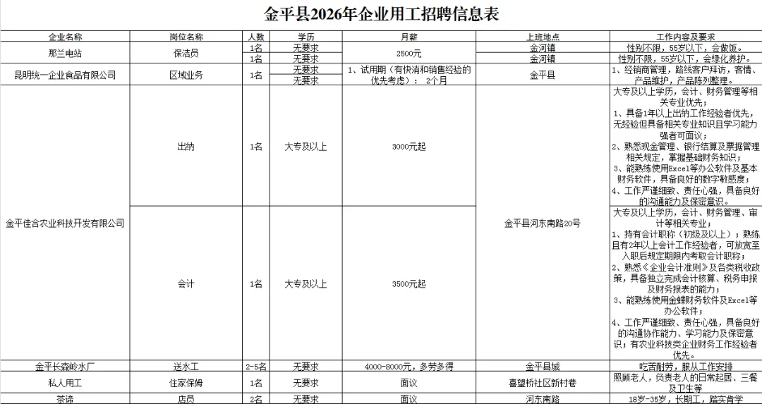 (扫码查看附件:2026年金平县企业用工岗位信息表;金平县2026年省内县外岗位信息表;2026年开远市人力资源市场企业招聘;2026年上海长宁赴云南劳务协作招聘岗位)