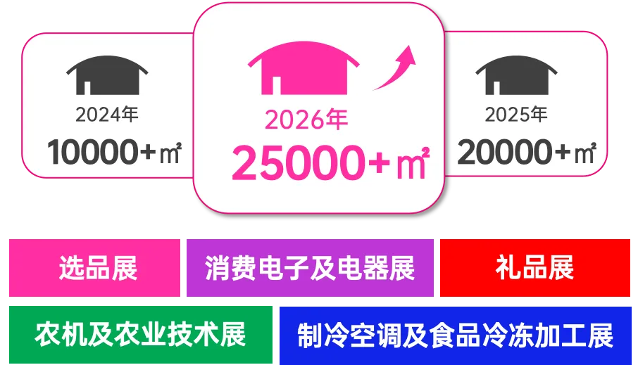 选品展、消费电子及电器展、制冷空调及食品冷冻加工展、农机及农业技术展、礼品展五展同开,选品展与专业展互补互利,吸引产业链相关企业共同参与,为供需双方搭建更高质量、更高效的沟通与合作平台,展览面积较上届翻了一倍。