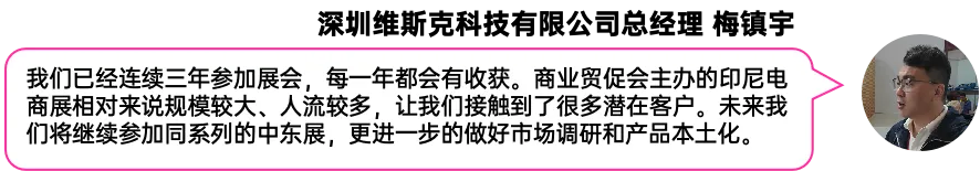 2025年印尼电商展展期3天,展览面积约1.8万平方米,来自中国、东盟地区国家的418家企业参展,其中国际企业92家。现场累计吸引25200名采购商及观众到场,达成意向成交额人民币 8亿元,较上届翻两番,创下历届新高。本届展会中国品牌呈现全产业集中出海态势,覆盖平台服务、智能制造、生活消费、时尚礼品、食品餐饮、冷链仓储、储能环保、造纸机械等核心领域的头部力量集体亮相。