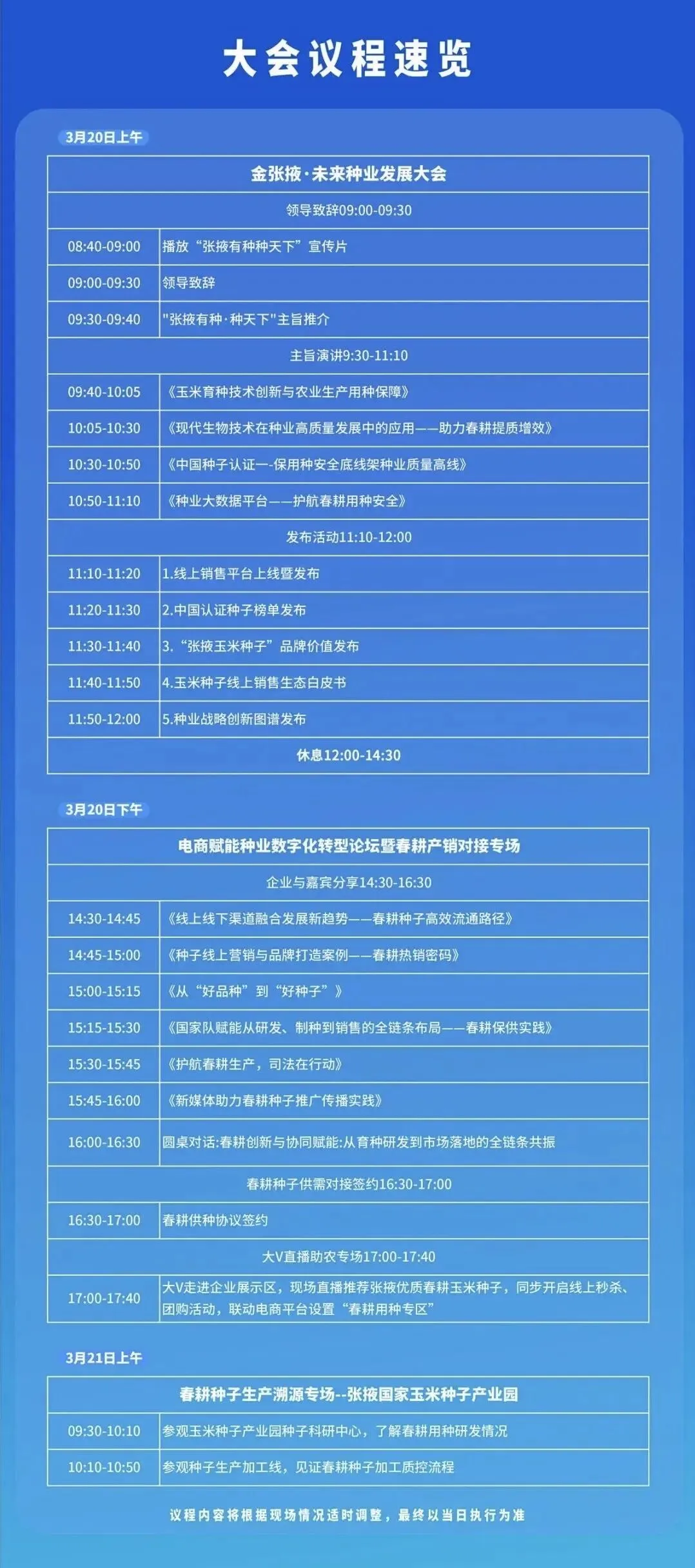 3月20日上午的开幕式将邀请国家有关部门和省市区相关领导出席,张掖市将作“张掖有种·种天下”主宾城市推介。大会邀请院士专家,围绕玉米育种技术创新、现代生物技术、种子认证体系等热点议题做主旨报告,并举办“种业市场净化与品牌建设”尖峰对话,为行业发展提供前瞻性指引。