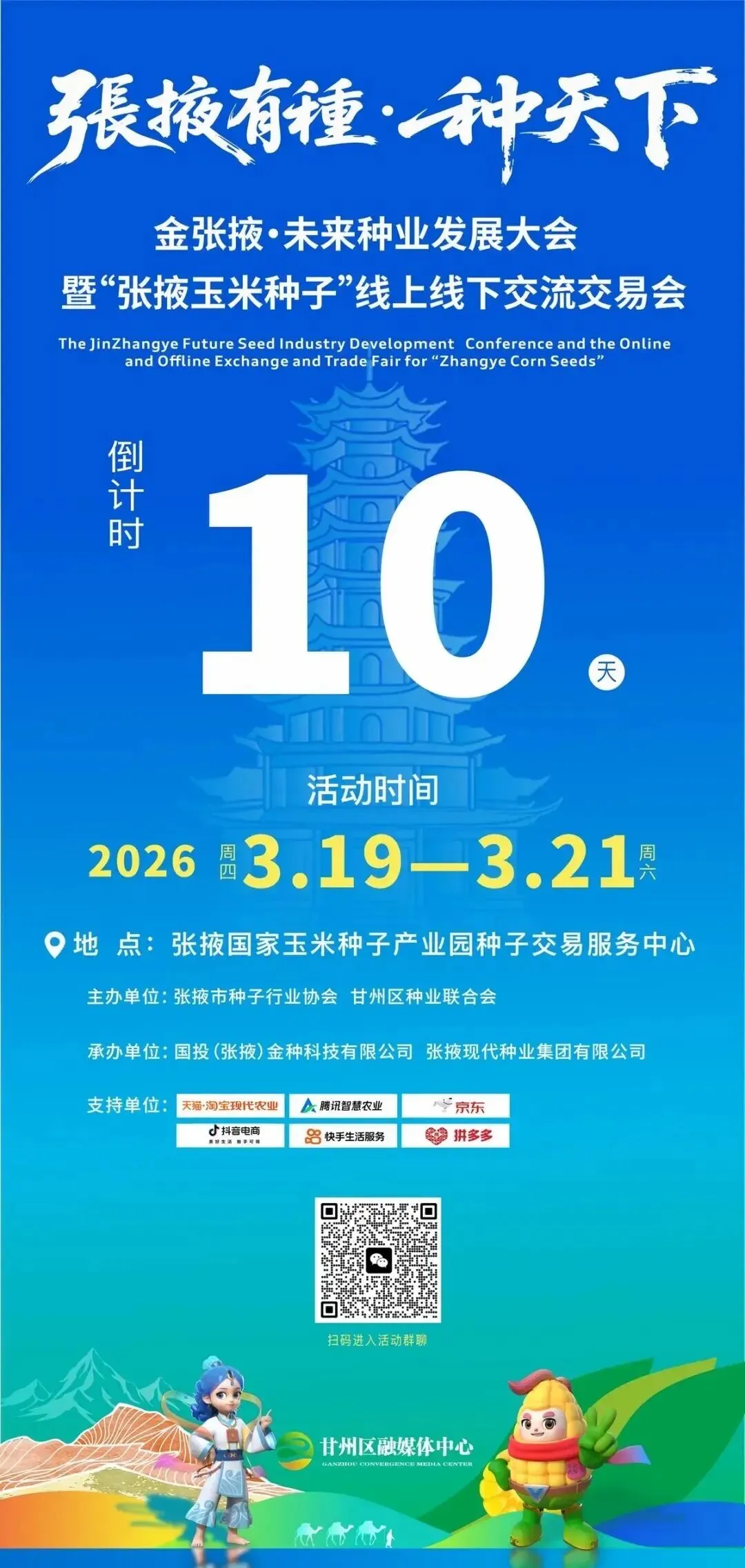 本次大会由张掖市种子行业协会、甘州区种业联合会联袂主办,国投(张掖)金种科技有限公司、张掖现代种业集团承办,并得到淘天集团现代农业、腾讯智慧农业、京东零售、抖音电商、快手生活服务、拼多多等主流电商平台的大力支持。