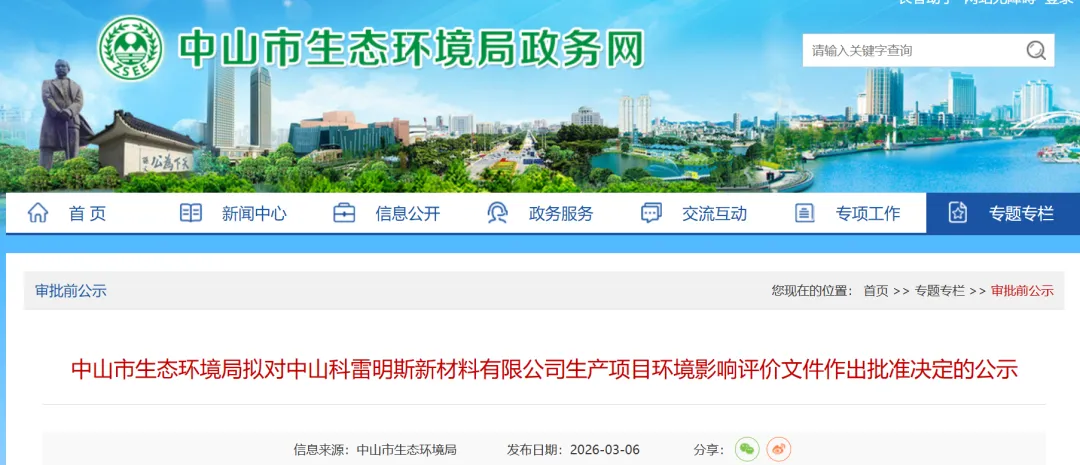 近日,中山市生态环境局拟对中山科雷明斯新材料有限公司生产项目环境影响评价文件作出批准决定的公示。