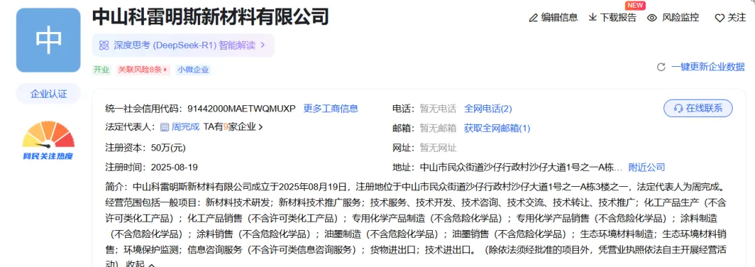 据悉,中山科雷明斯新材料有限公司成立于2025年08月19日,注册地位于中山市民众街道沙仔行政村沙仔大道1号之一A栋3楼之一,注册资金50万元,法定代表人为周完成。主要经营新材料技术开发与转让,涂料、油墨制造与销售。