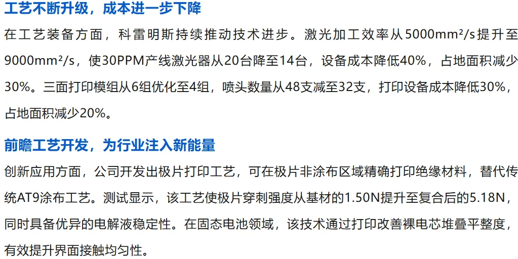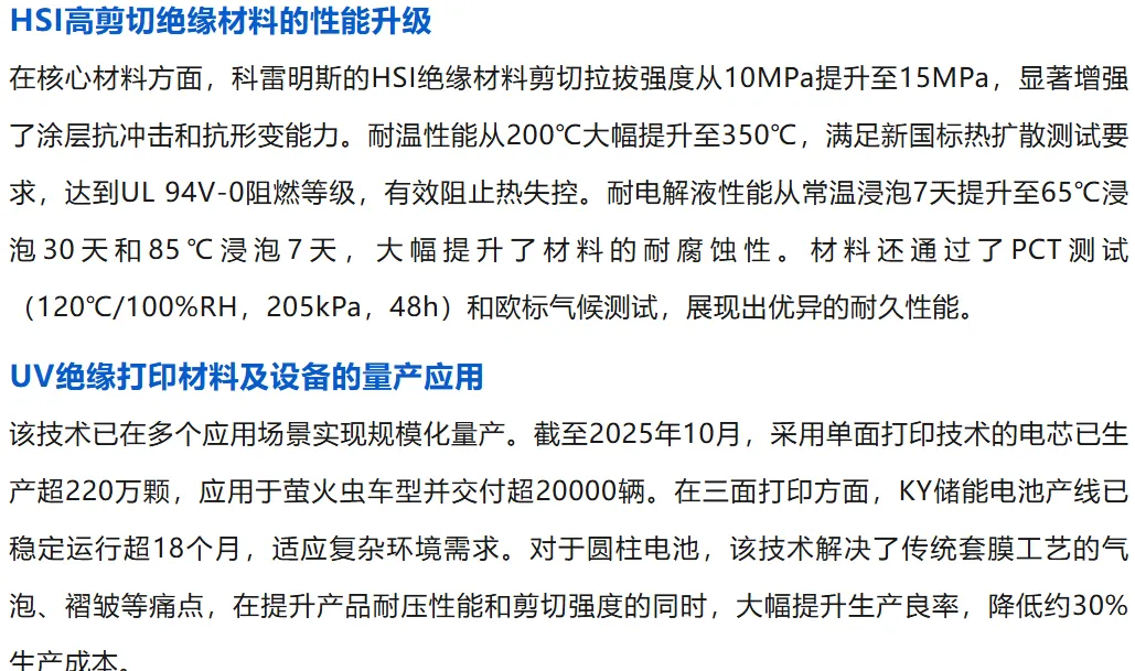 据悉,公司的UV绝缘打印技术已应用于萤火虫量产车型上,生产了超过220万颗电芯,交付了2万多辆车;设备已稳定生产18个月以上,经过多项实践检验;这项技术不是实验室里的测试,而是量产设备的实际产出;HSI高剪切绝缘材料耐温从200度提升到了350度,全面符合新国标对电池热扩散测试时不起火、不爆炸的要求,从源头上杜绝风险。