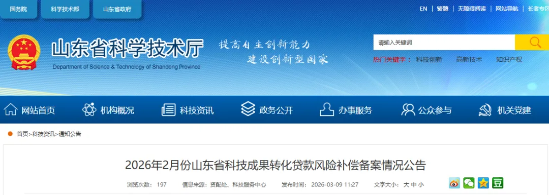 2026年2月份山东省科技成果转化贷款风险补偿备案情况公告