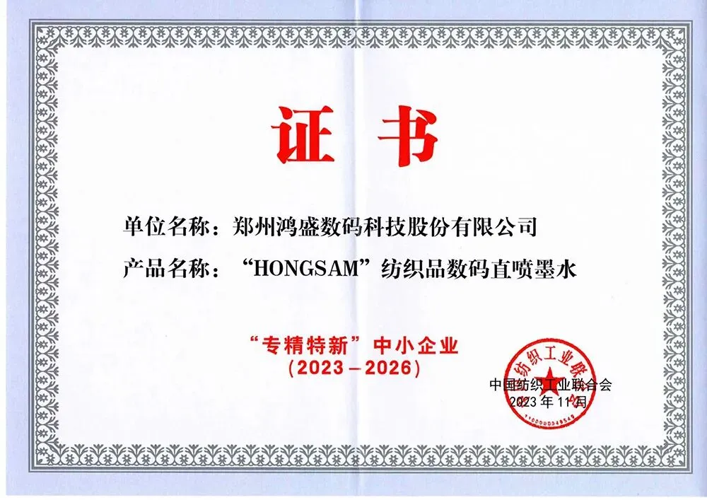 2025年11月,“HONGSAM®阳离子染料墨水”入选“纺织之光 2025年度纺织行业专精特新新产品、新技术推介合作项目汇编”。