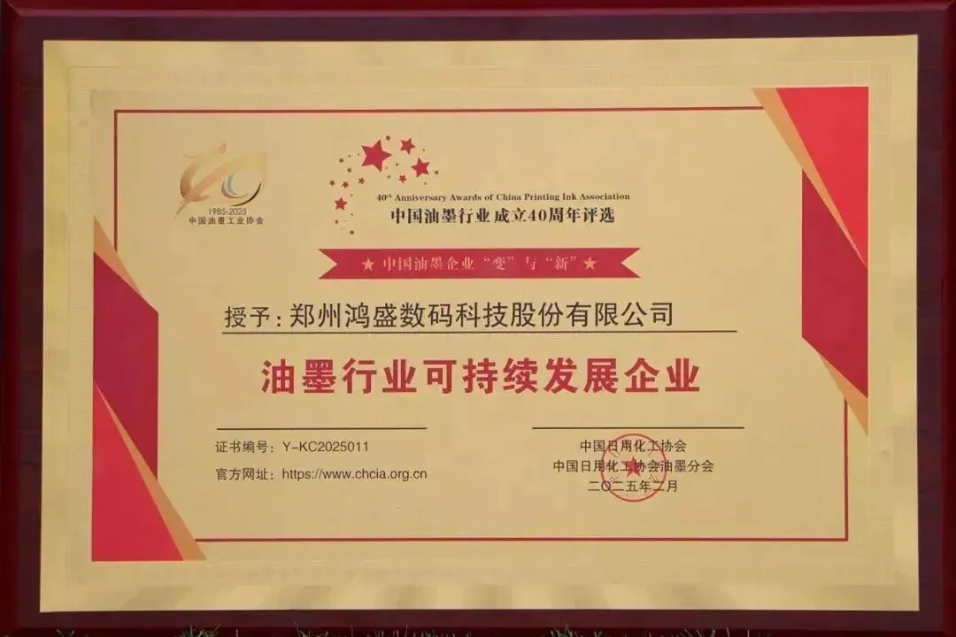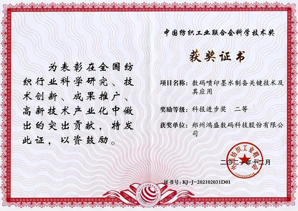 2021年,鸿盛数码和郑州大学合作的“数码喷印墨水制备关键技术及其应用”项目荣获“中国纺织工业联合会科技进步二等奖”