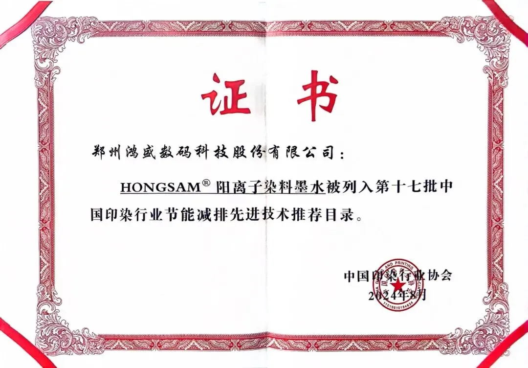 2024年,“HONGSAM®阳离子染料墨水”入选第十七批中国印染行业节能减排先进技术推荐目录