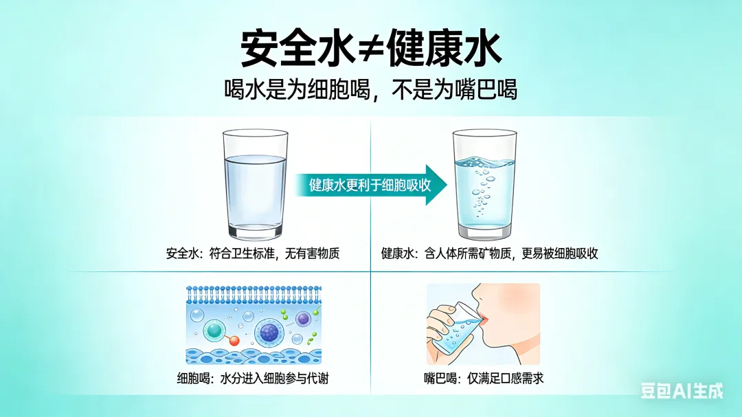权威专家李复兴教授早已指出:“安全水不等于健康水。喝水是为细胞喝,不是为嘴巴喝。”