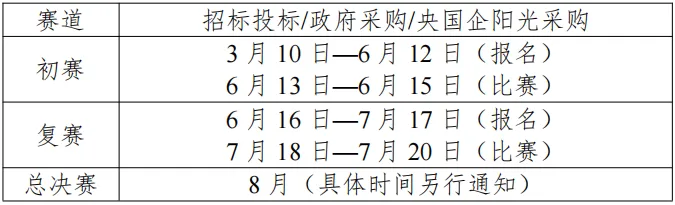 1.参赛形式:招标投标、政府采购、央国企阳光采购3个赛道均设置个人赛与团体赛,个人赛选手及团体赛参赛单位可同时报名上述3个赛道。