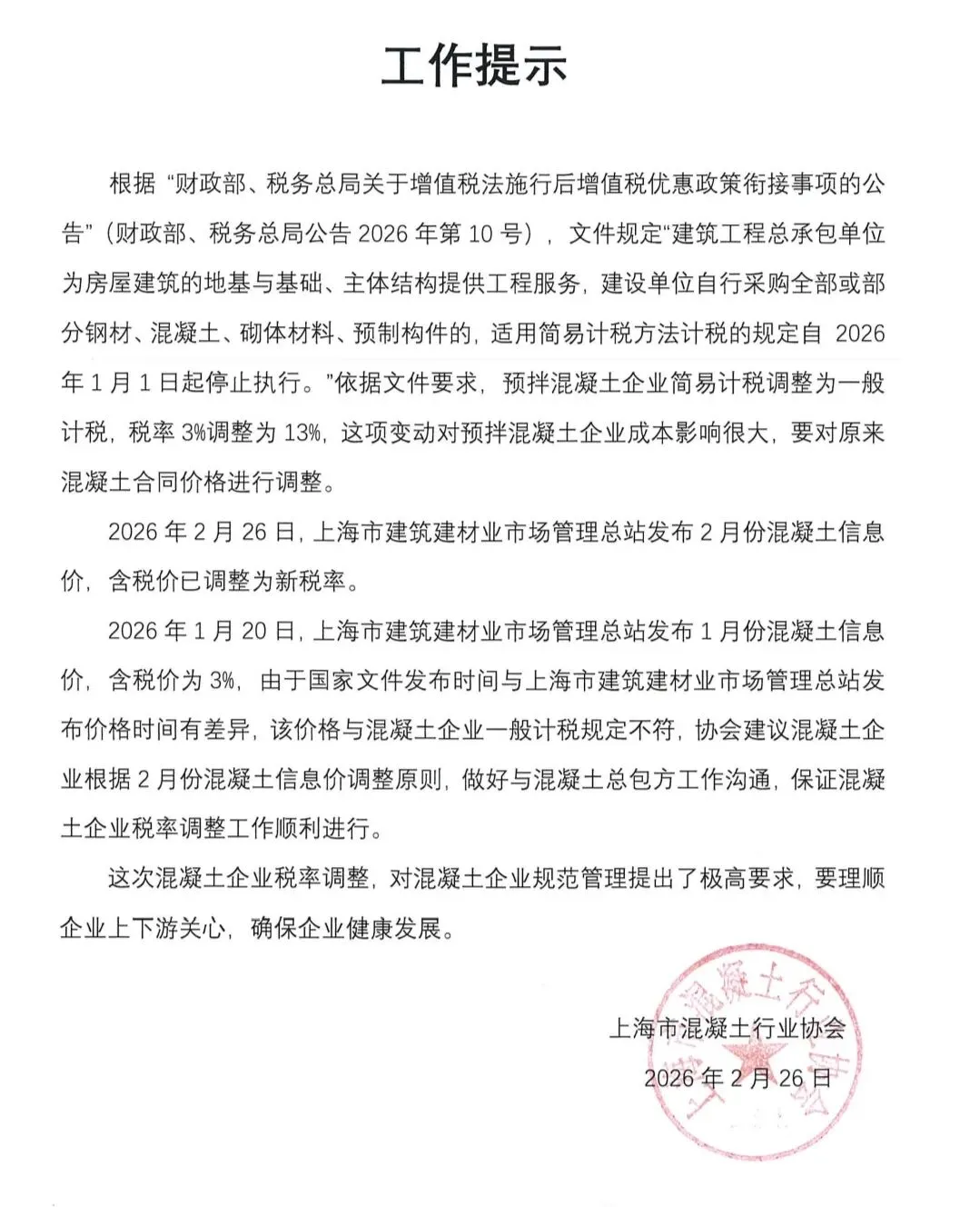 上海市混凝土行业协会发布“预拌混凝土企业税率调整工作提示”