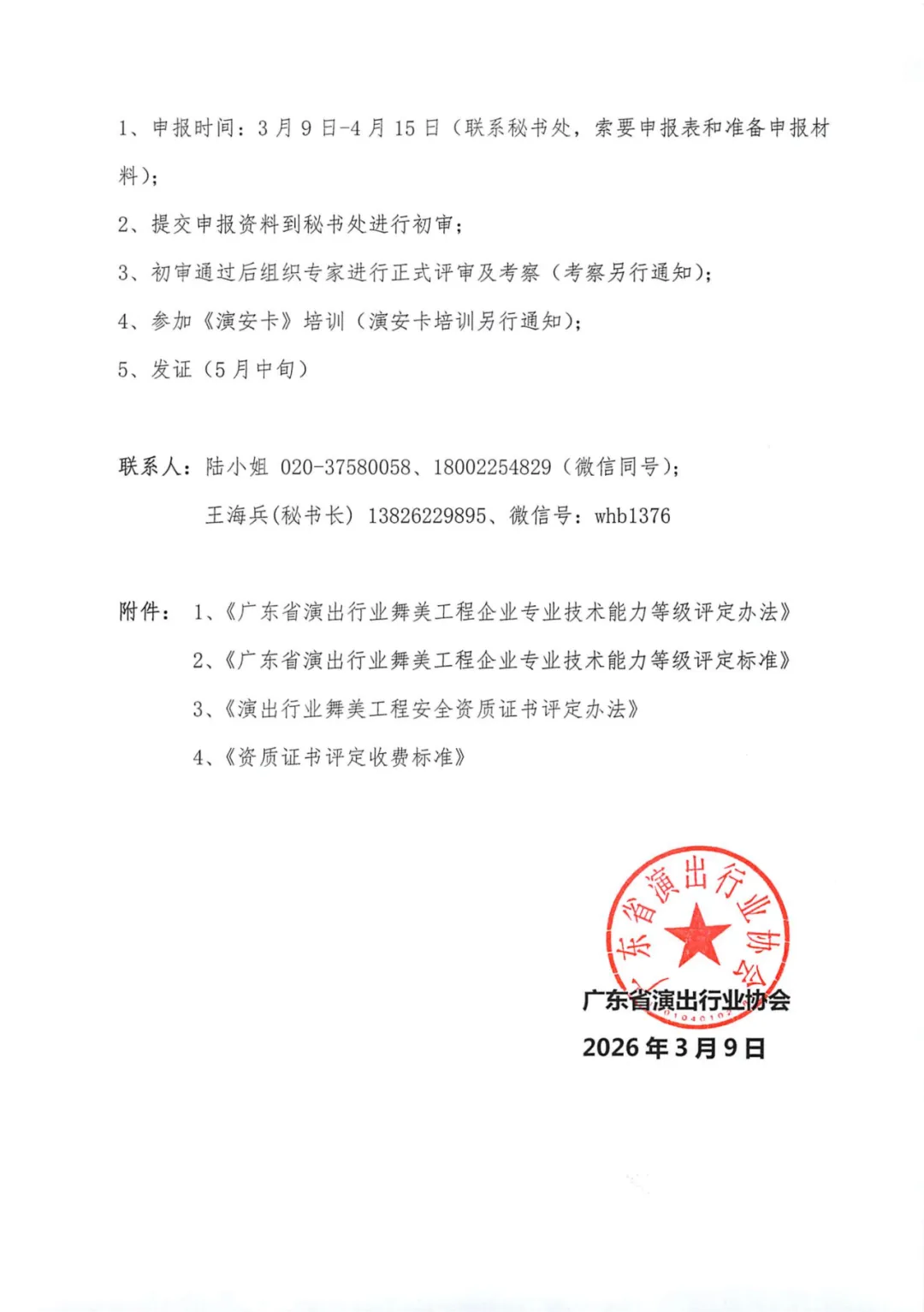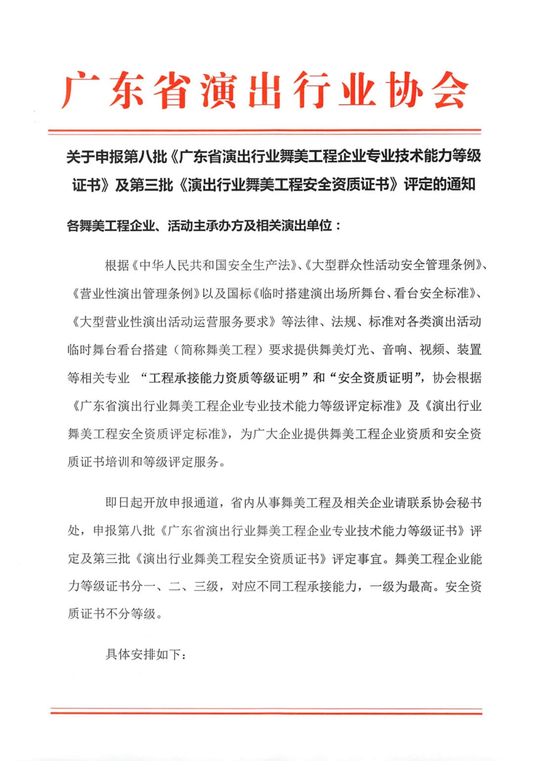 关于申报第八批《广东省演出行业舞美工程企业专业技术能力等级证书》及第三批《演出舞美工程安全资质证书》评定的通知
