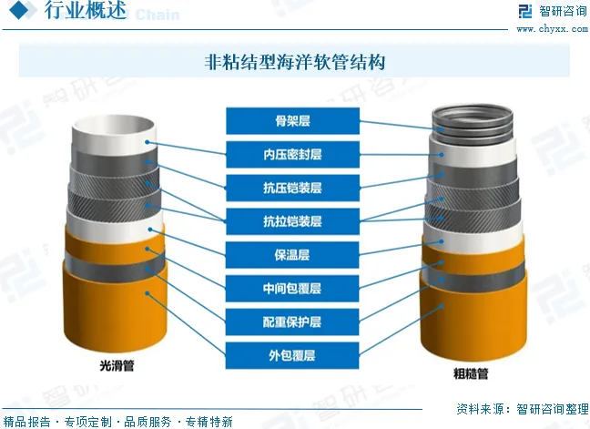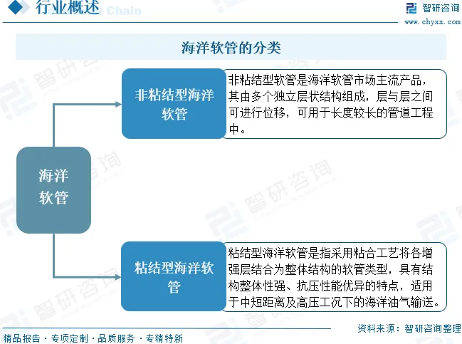 海洋软管,又称海底软管、海上石油软管,是指一种用于海洋石油勘探、开采、生产、运输的,由金属和聚合物材料制备而成的软管。海底管道是海上油气田的生命线,海洋软管作为海底管道的一种型式,主要用于海上石油勘探、开采、运输领域,具体作用在于连接采油平台与海底油气井,实现石油、天然气的输送。根据制造工艺不同,海洋软管主要分为非粘结型海洋软管和粘结型海洋软管,其中,非粘结型软管是海洋软管市场主流产品,其由多个独立层状结构组成,层与层之间可进行位移,可用于长度较长的管道工程中。