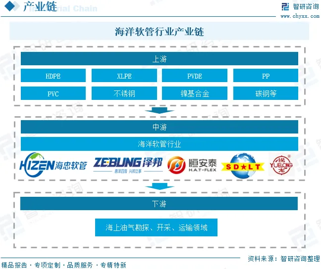海洋软管作为海洋工程领域的关键装备,其工作环境复杂严苛,需长期耐受海水腐蚀、高压冲击及复杂海洋气象条件,因此对材料的耐腐蚀性、抗压强度及耐久性具有极高要求。海洋软管产业链结构完整,涵盖上游原材料、中游制造与下游应用三大环节。产业链上游为原材料,主要有用于制造内衬层、耐磨层的HDPE(高密度聚乙烯)、XLPE(交联聚乙烯)、PVDE(聚偏氟乙烯),用于制造保温层的PP(聚丙烯)、PVC(聚氯乙烯),用于制造骨架层、抗压铠装层的不锈钢、镍基合金、碳钢等。产业链中游为海洋软管的生产制造环节。产业链下游为应用领域,主要用于海上油气勘探、开采、运输领域,具体作用在于连接采油平台与海底油气井,实现石油、天然气的输送。