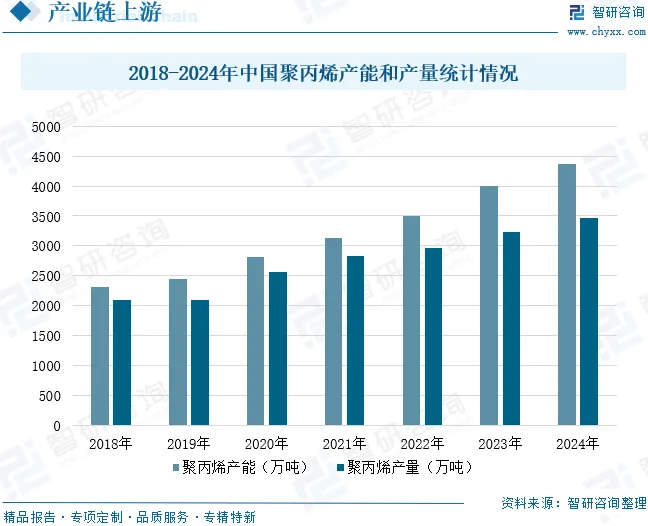 聚丙烯作为海洋软管制造中的关键原材料,主要承担保温层构建的核心功能,其性能直接决定了软管在复杂海洋环境中的热稳定性与介质输送效率。近年来,为了满足下游市场发展需要,我国聚丙烯生产企业积极扩产,使得行业处在持续的扩能当中,产能不断扩张,从2018年的2317万吨增长至2024年的4369万吨,年复合增长率为11.15%。与此同时,随着新增产能不断释放,全国聚丙烯产量也呈现稳步提升态势,从2018年的2092万吨增长至2024年的3472万吨,年复合增长率为8.81%。在供给能力不断增强的推动下,我国聚丙烯自给率逐年提升,目前已达到90%以上,实现了较高水平的自给能力。