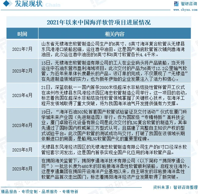 近年来,中国海洋软管企业正加快海洋软管技术研究,为我国海洋油气勘探开发提供了关键装备支撑,其国产化突破有效保障了深海油气资源的自主开发能力,降低了对外依存度,为提升国家能源安全奠定了坚实基础。例如,2025年4月21日,深蓝启航——国内首条2000米级超深水非粘结挠性管样管开工仪式在滨州市无棣县东风港经济园区海忠软管制造公司举行。这一项目的启动,标志着我国在超深水非粘结挠性软管领域掌握了关键核心技术,在海洋工程开发领域取得了重大突破,将为我国海洋油气开发提供强有力支撑。2025年6月19日,“海洋石油302轮首套国产软管试验鉴证及交付活动”仪式在厦门科学城未来产业园(先进制造园)举行。作为国家级“专精特新”高科技企业,厦门卓励石化设备有限公司是此次交付的LNG复合软管的制造方,其率先通过了国际国内权威第三方型式认可,且搭建了完整自主知识产权的型式试验平台。此次国产软管的测试成功与交付,打破了我国在该领域长期依赖进口的局面,是船用LNG软管国产化的重要里程碑。2025年8月,在揭阳海关监管下,揭阳亨通海洋技术有限公司(以下简称“揭阳亨通公司”)一批总长度为460米的非粘接海洋柔性软管顺利装船,启程发往海外。这是亨通集团在揭阳开设海洋产业基地以来,自主研发的非粘接海洋柔性软管产品首次走出国门,标志着揭阳海洋经济产业发展取得了新突破。
