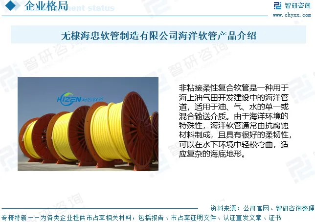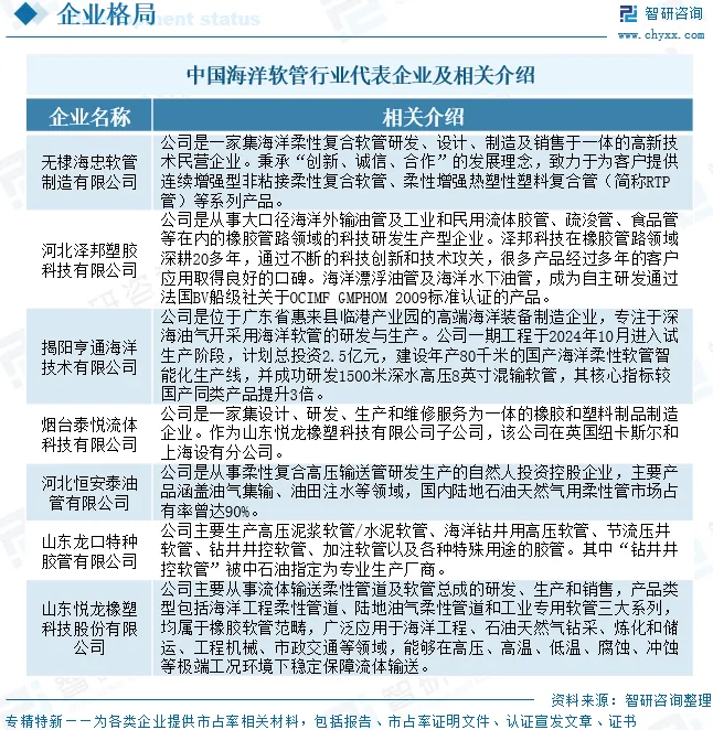中国海洋软管行业已形成以本土企业为主导的竞争格局,其中无棣海忠软管制造有限公司是国内首家、世界第4家海洋软管制造商,凭借先发优势与技术积累,已占据国内市场主要份额,成为行业领军者。与此同时,河北泽邦塑胶、揭阳亨通海洋技术、烟台泰悦流体、河北恒安泰、山东龙口特种胶管及山东悦龙橡塑等企业共同构建了完整的产业体系。随着国内企业持续加大研发投入,国产海洋软管在技术性能方面已达到国际领先水平,行业整体正步入快速发展的新阶段,展现出广阔的市场前景。此外,漯河利通液压科技股份有限公司也在积极开展海洋软管业务,2025上半年,公司API 17K海洋石油管产线设备已陆续到货安装,目前正在有序推进海洋石油软管产线的建设,预计2025年Q4完成产线建设和试产工作。