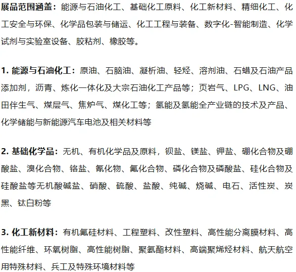 本届展会继续纵深贯穿全产业链条——从能源化工、基础原料到高端新材料、精细化学品,从工程装备、智能制造到安全环保、包装储运,打造集前沿技术发布、精准商贸对接、高端趋势研判、产学研深度融合于一体的国家级行业交流平台;全景呈现石油化工产业的创新脉动与技术突破。