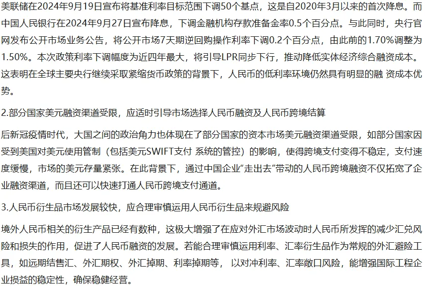 国际收支平衡的促进与外汇储备的多元化:推动人民币在国际工程承包中的使用,减少对外币依赖,提升经济开放度与国际影响力。金融市场互联互通的深化:通过CIPS系统,国际工程企业能够更便捷地参与国内外金融市场,整合资源,获取多元化的投融资机会。这不仅有助于提升企业的融资效率和灵活性,还促进了全球金融资源的优化配置和金融市场的深度融合。