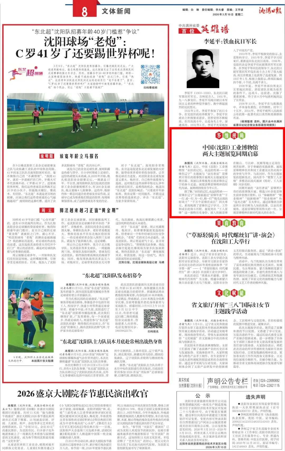 沈阳日报、沈报全媒体记者 谢飞燕 近日,中国(沈阳)工业博物馆“永恒的记忆,永远的传承——雷锋在辽宁”主题展与“亲历者说”雷锋照片背后的故事图片展两大主题展览同期启幕。双展以多维视角呈现雷锋在辽宁的奋斗足迹,深度诠释雷锋精神的时代内涵,展期将持续至今年6月。据了解,“永恒的记忆,永远的传承——雷锋在辽宁”主题展通过“雷锋年表”“干一行、爱一行、专一行、精一行”“做毛主席的好战士”“千万个雷锋在成长”四大单元,系统梳理了雷锋在辽宁学习、工作和成长的奋斗历程。展览突出“工人雷锋”这一独特历史身份,深入挖掘雷锋在鞍山、弓长岭、抚顺等地立足岗位、刻苦钻研、甘于奉献的实践故事,展现雷锋精神在共和国工业建设火热实践中的孕育与升华。与此同时,作为主题展览的创新亮点,国内首个“数智工人雷锋”多模态沉浸式展演《你好,工人雷锋》同步亮相。同期开展的“亲历者说”雷锋照片背后的故事图片展,精选100余张雷锋生前珍贵图片资料,以“奉献精神”“敬业精神”“创新精神”“创业精神”和“追光之路”五大单元,通过影像语言讲述照片背后鲜为人知的故事,以亲历者视角,还原雷锋短暂而伟大的一生,呈现雷锋精神在新时代强大的生命力。