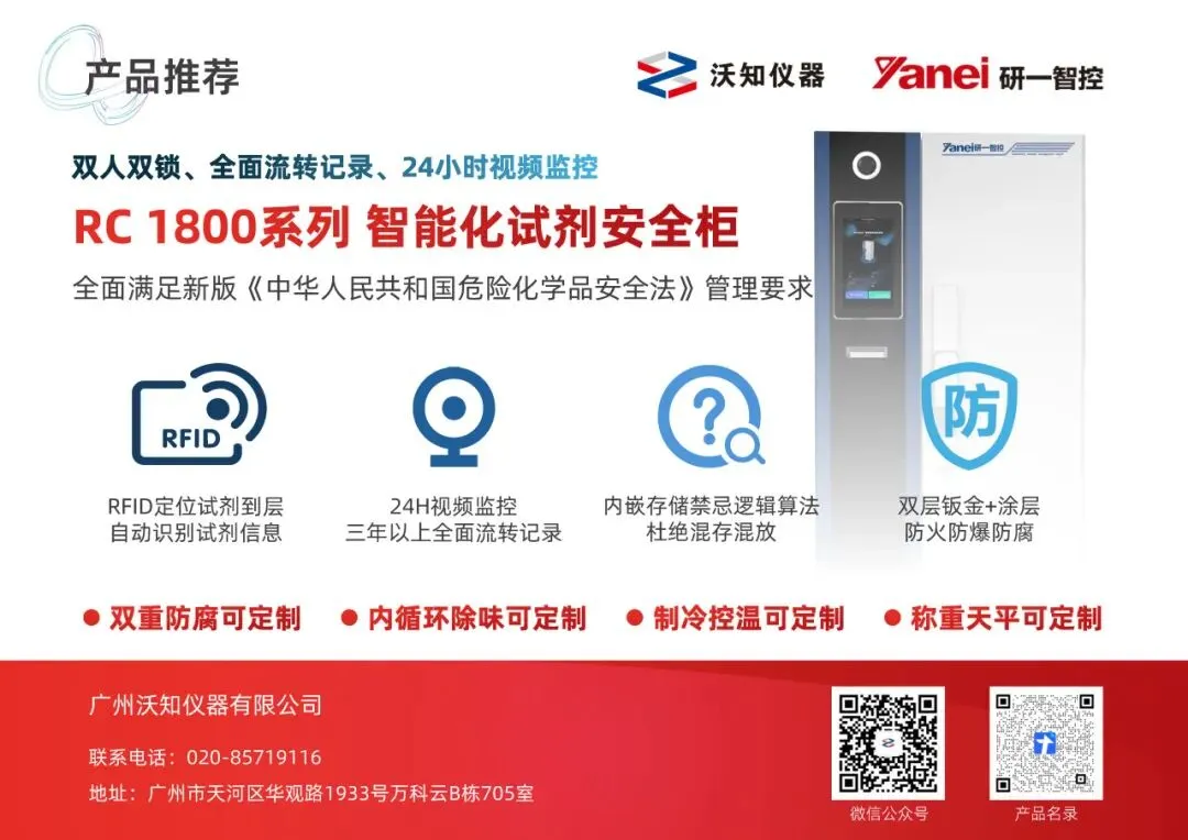 沃知仪器与研一智控深度合作,在行业率先推出“实验室试剂智能化管理”解决方案,基于制造为体,研发为翼的有力支撑,以“人、机、料、法、环、测”为基础研发需求模式,将人、物、境相连并进行统筹管理,解决化学试剂等物资的全生命周期管理问题,全面满足新版《中华人民共和国危险化学品安全法》对于危险化学品存储、管理、记录等多方面要求。