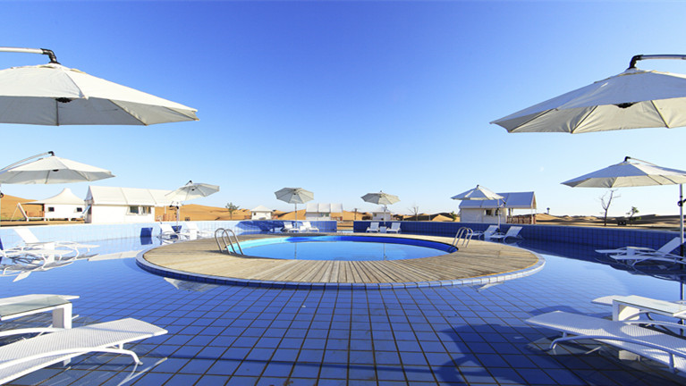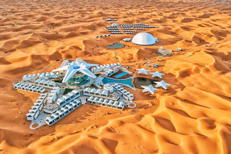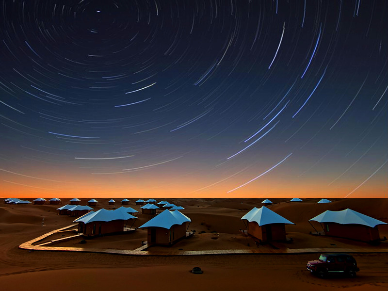 大漠星河旅游度假区距离市区30公里处,是集沙漠休闲度假、赛事竞技表演、探险旅拍、游乐康养及定制化旅游服务于一体的综合性高端度假营地,可提供轻奢度假、时光晚餐、星河科普、冲浪赛车、UTV专业竞技表演、乘驼看日出等新时尚的体验项目。