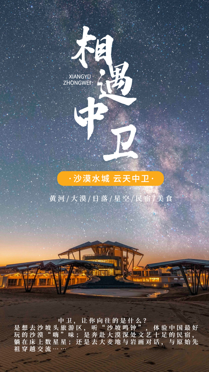 春夏之交的宁夏,既有星汉灿烂的浪漫,又有多彩田园的诗意,还有人间烟火的治愈。五一假期快来喽,一起来宁夏,品红酒、吃羊肉、观星空。在“宁夏二十一景”中,在村野民宿内,在吴忠早茶里,解锁关于星星故乡之美的更多源代码,畅享家人同游的美好,遇到更灵动自由的自己。今天我们一起走进“沙漠水城 云天中卫”,在寻根黄河游、大漠观星游、酒庄美食游精品线路中体验黄河文化的魅力、大漠星河的浪漫、沙水相依的奇观和舌尖上的特色风味。