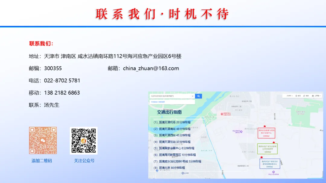 【注安消防产品交易中心】座落在天津市津南区咸水沽镇南环路112号,是致力于“火灾、地震、气象、交通、水域、卫生、低空 、通信、环境、安防、危化”等公共安全领域,打造汇集:应急物资仓储、应急装备展示、应急科普培训、应急救援队伍驻训、应急日常演习训练、应急物资快速调运、应急装备集散联运、应急产品销售贸易、应急物资供应链服务的多场景综合服务平台。 【注安消防产品交易中心】以“为平时提供预防,为战时提供保障”的核心理念,积极推动“公众服务、专业服务、决策服务、专项服务”的发展目标,积极推进应急物资“实物储备+产能储备+协议储备+”的建设,为“防灾,减灾、抗灾”在管理、调拨、配送的全过程动态管控,提供 “随时可用、按需可调,持续供应”的应急保障解决方案。