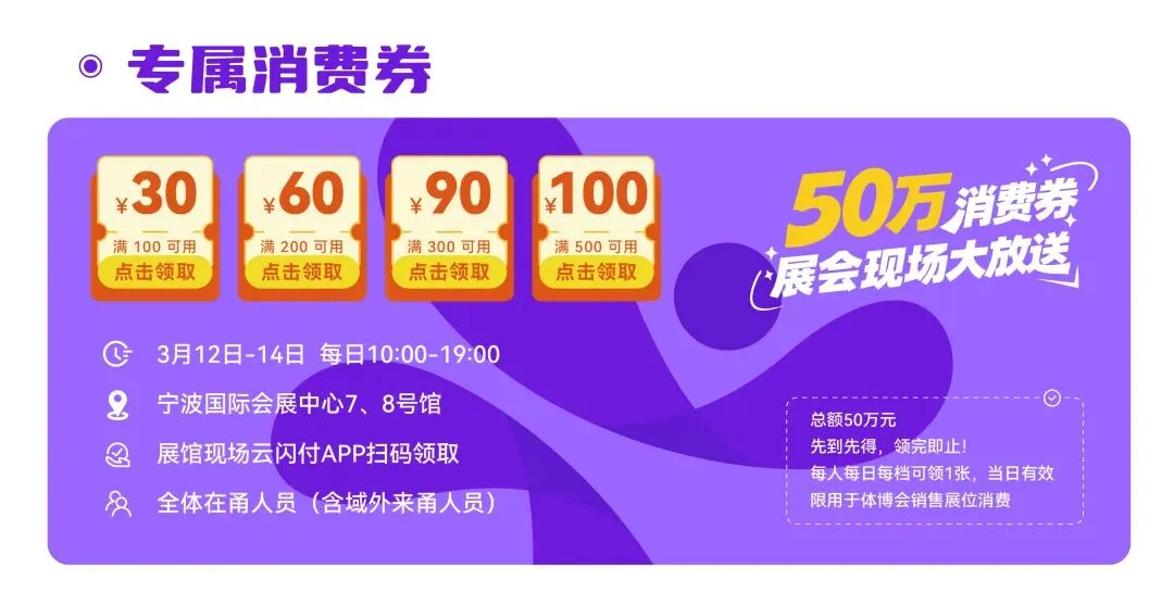 本次消费券采用展馆现场云闪付APP扫码领取的方式,每日发放时间为10:00至19:00。券面涵盖满500减100、满300减90、满200减60、满100减30四档优惠,每人每日每档可领1张,当日有效,在体博会现场消费券指定展位均可消费使用。