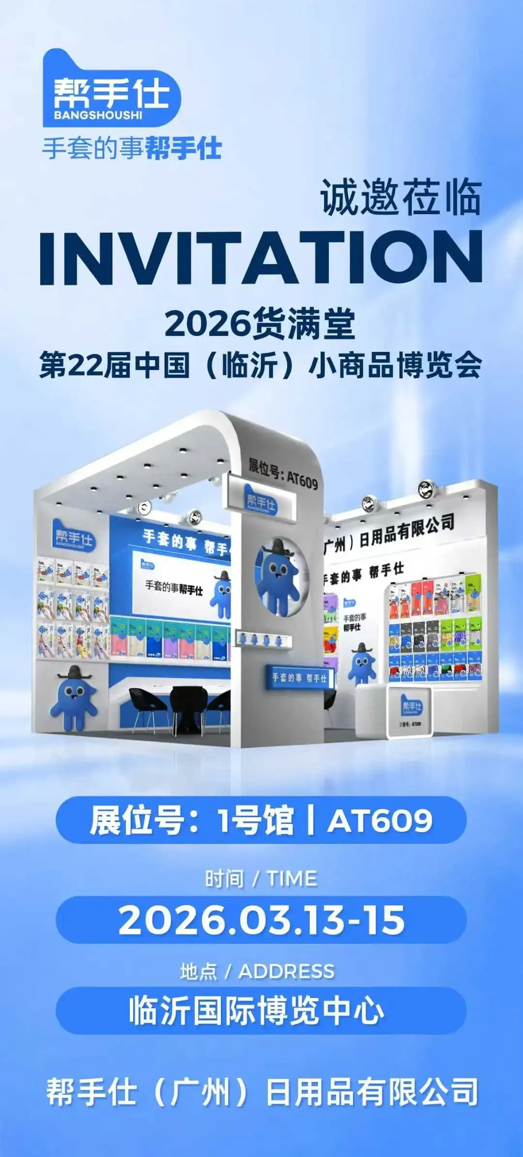 春启新程,智启商机!值此第18届中国(临沂)多元百货博览会盛大启幕之际,帮手仕(广州)日用品有限公司诚挚邀请您莅临展会现场,共鉴品牌蜕变,共探手套行业新机遇,共启2026共赢新篇!