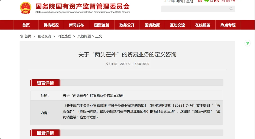 而对于 “两头在外” 的贸易,明确指为赚取购销差价,原始采购端与最终销售端均在本中央企业集团外的商品买卖活动。比如说,某央企旗下子公司,从集团外采购原材料,加工后卖给集团外另一企业,这就属于 “两头在外” 贸易。同一央企集团子公司间内部贸易,由于采购和销售都在集团内,不属于 “两头在外”。