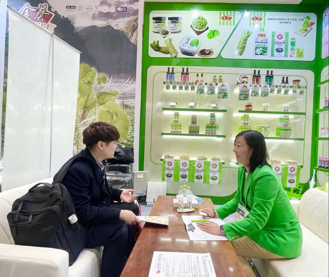 在金葵展台,山葵酱凭借优质原料与全产业链品质把控,呈现出清鲜甘冽、辛香回甘的正宗风味,与金枪鱼、三文鱼等高端海鲜搭配,相得益彰,带来惊艳的味觉体验。现场众多国际采购商与美食达人纷纷驻足品鉴,一位日本采购商更是由衷赞叹:“没想到山葵的辛香与海鲜能融合得如此巧妙!”