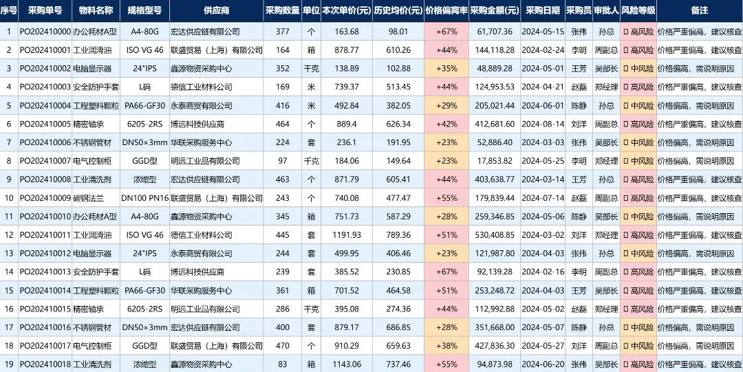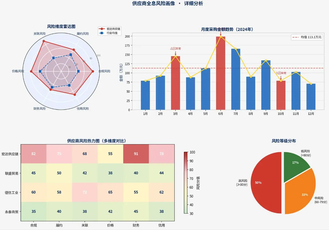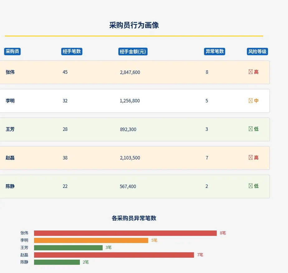 这类成果很有意思。它不是只告诉你“有几条问题”,而是把一个供应商、一个采购员、一个品类,甚至一个采购项目,做成一张“画像”。