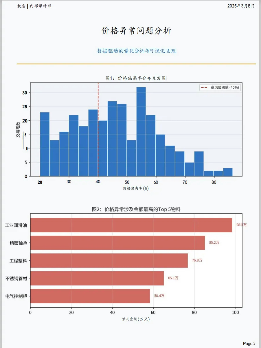 再比如,围绕“采购价格异常与降本空间”做专题测算,不仅能识别高风险异常交易,还能直接估算降本潜力。这个就非常有杀伤力。因为管理层一看就明白:这不是审计在讲道理,这是审计在用数据说话,在帮企业算账,在帮企业找真金白银。
