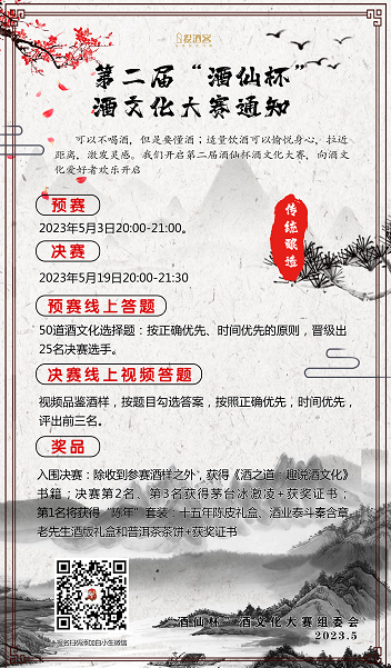 通知,第二届“酒仙杯”文化大赛5月3日开赛,免费报名参加,没有入群喜欢酒文化的朋友,扫码加“白小生”入群。