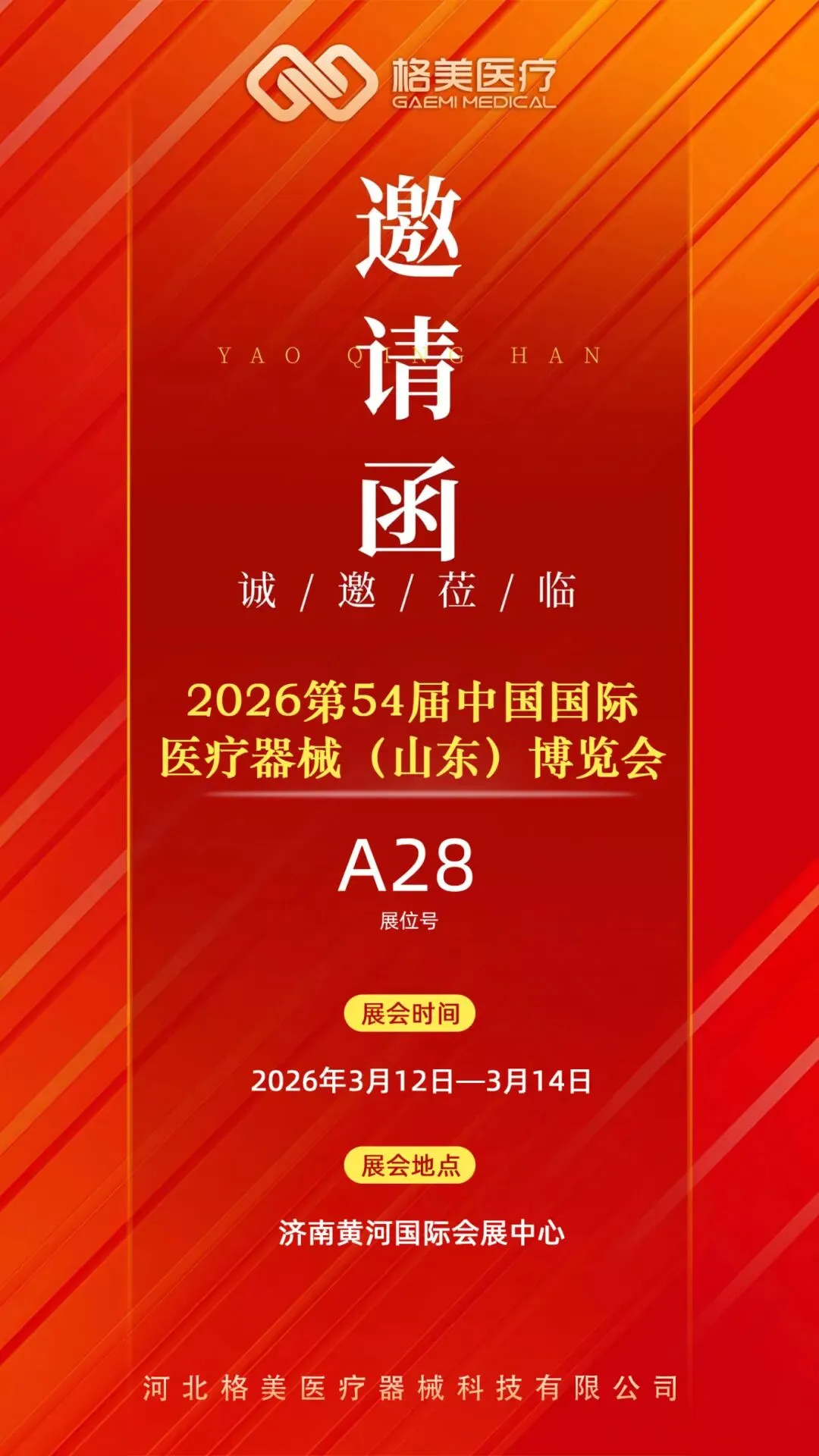 3月12日-14日,第54届中国国际医疗器械(山东)博览会将于济南黄河国际会展中心隆重召开。格美医疗诚挚邀请各界同仁、行业专家、合作伙伴莅临 A28 展位 ,共赴这场医疗健康产业盛宴。