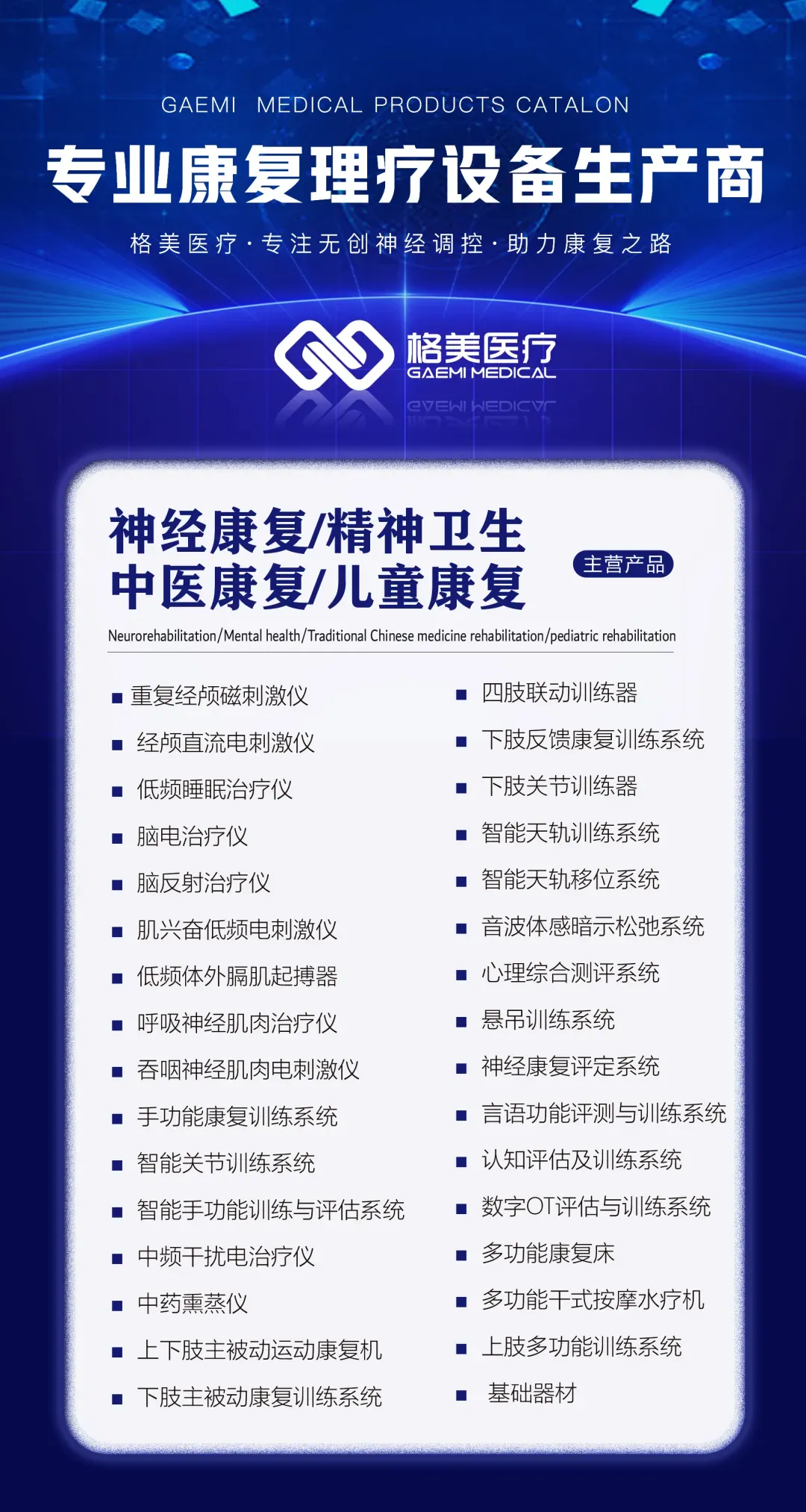 河北格美医疗器械科技有限公司是一家康复+养老设备的研发、生产、销售于一体的现代化高新技术企业。公司拥有齐全、完整的医疗器械及康复设备产品线,为广大客户提供神经、睡眠、精神、心理康复设备及综合解决方案。