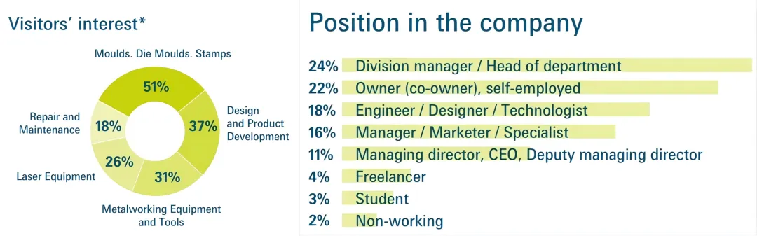 产品设计与开发:产品工业设计、产品开发与工程、三维模型建模与优化、数字原型、逆向工程、产品结构的技术分析、CAD/CAM/CAE/PDM/PLM软件、综合工程服务; 灌入模具,切割模具、冲压磨具:注塑模具、挤出和吹塑模具、浇注和真空模具、模具(冲压、弯曲、成型等)、特殊零件成型、标准组件和零件、热流道、加热器、传感器、模具快速接头; 设备与工具:金属加工机械与设备、激光和雕刻设备、测量设备和仪器、切割和成型工具、工具钢和合金、液压和机械压力机、零件加工、工业和协作机器人; 维修与服务:模具维修设备及工具、模具的维修和修整、表面处理和模具抛光服务、热处理服务、模具精加工和测试、模具保养和维护产品、保修和保修后的服务、培训和资格审定; 3D-TECH-增材制造和3D打印:工业3D打印机和装置、专业和个人3D打印机、3D扫描仪、3D打印服务/增材制造、后处理设备、3D硬件软件、3D打印材料、组件和配件