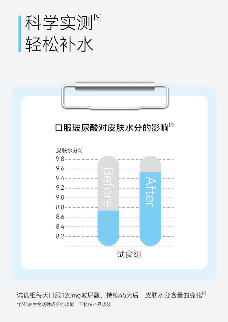 而人体功效实验证明,每天口服120mg玻尿酸,持续45天后,皮肤水分含量会有显著提升。