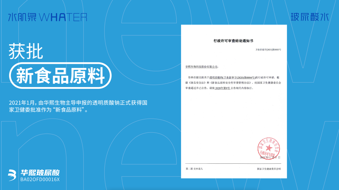 众所周知,华熙生物是一家专注于生物活性物的生物科技公司,最为人所熟知的,是其拳头成分玻尿酸。玻尿酸不仅在护肤、药械领域广泛使用,更在2021年1月由国家卫健委认证为新食品原料,从此玻尿酸可以进入普通食品领域。