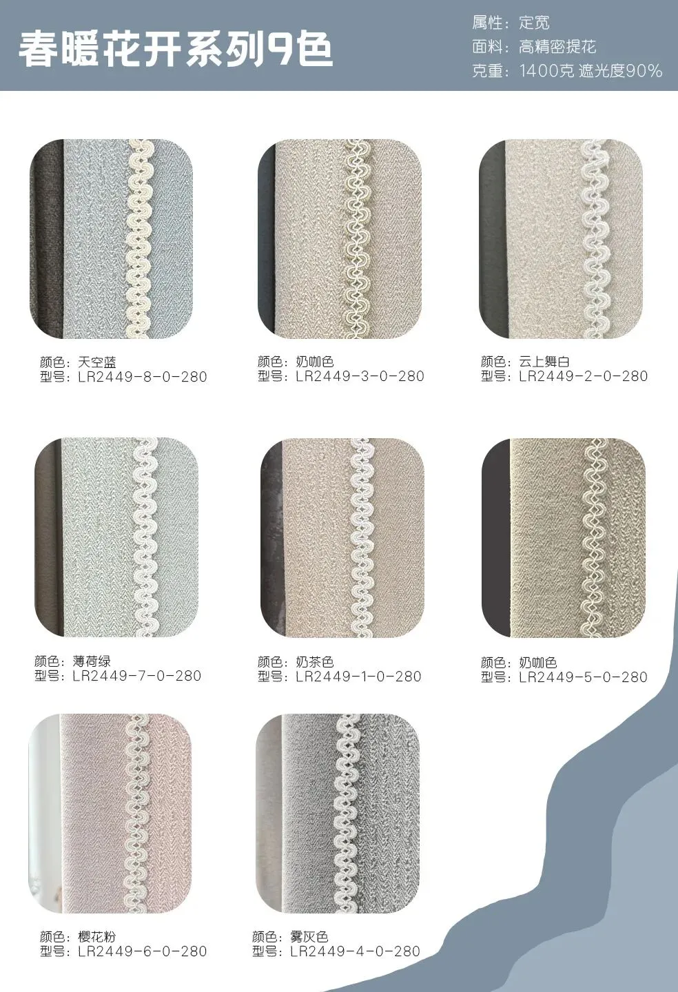 属性:定宽 面料:高精密提花 克重:1400克 遮光度90%