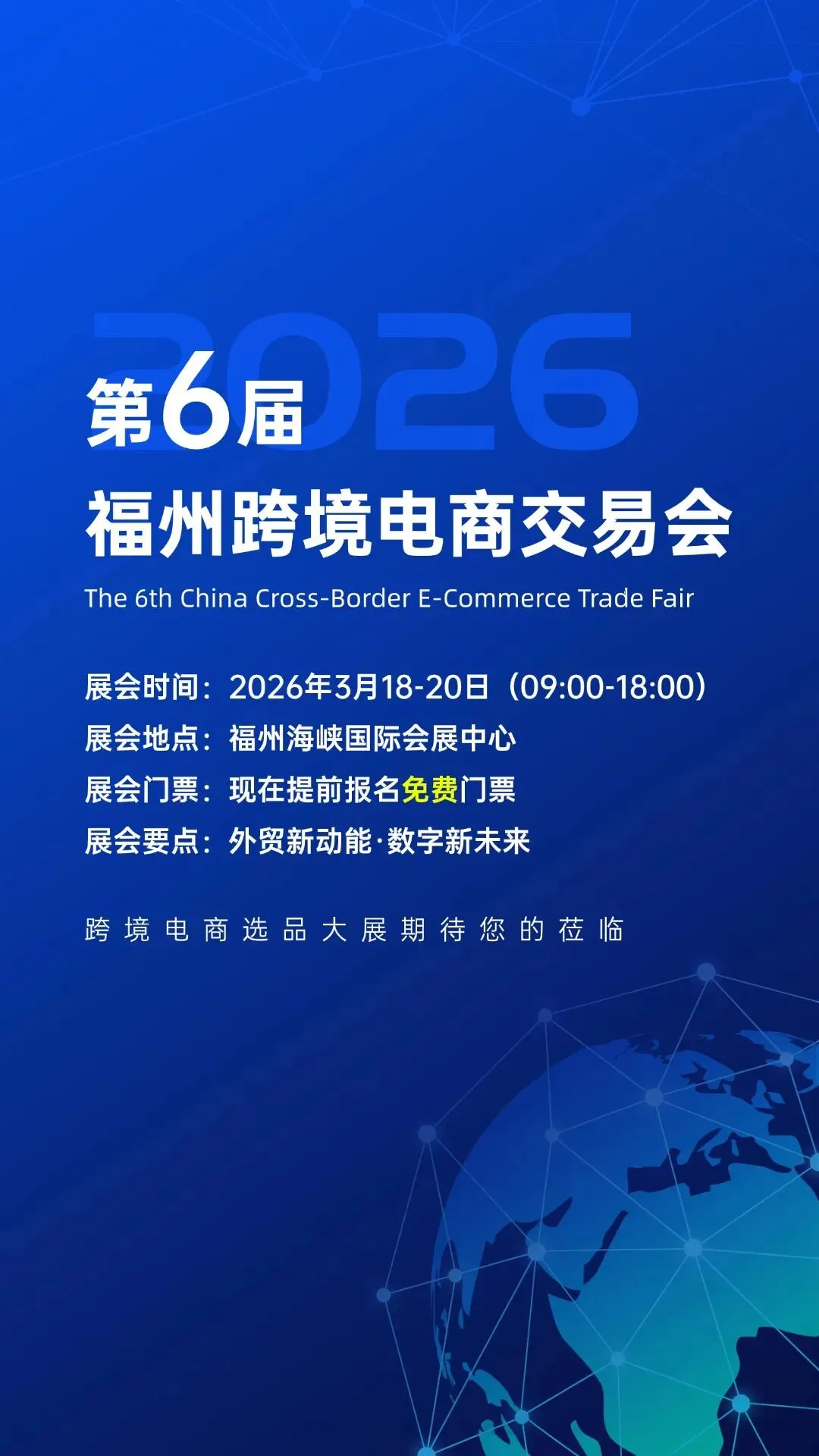 开年抢订单,跨境找商机!第六届中国跨境电商交易会(简称:2026福州跨交会),将于2026年3月18日至20日在福州海峡国际会展中心火热开展!本届展会预计吸引超10万人次专业观众到场,打通源头工厂与全球采购商的直连通道。