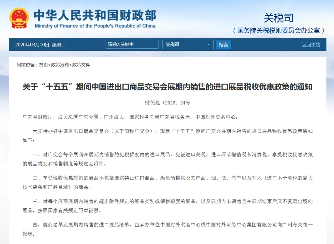 为更好发挥中国进出口商品交易会(以下简称广交会)对外开放平台作用,财政部、海关总署、税务总局联合印发《关于“十五五”期间中国进出口商品交易会展期内销售的进口展品税收优惠政策的通知》,明确对“十五五”期间举办的广交会,每个展商在展期内销售的免税额度内的进口展品,继续免征进口关税、进口环节增值税和消费税。同时,为进一步释放政策效应,免税销售额度由按年度计算调整为按每届展会计算。